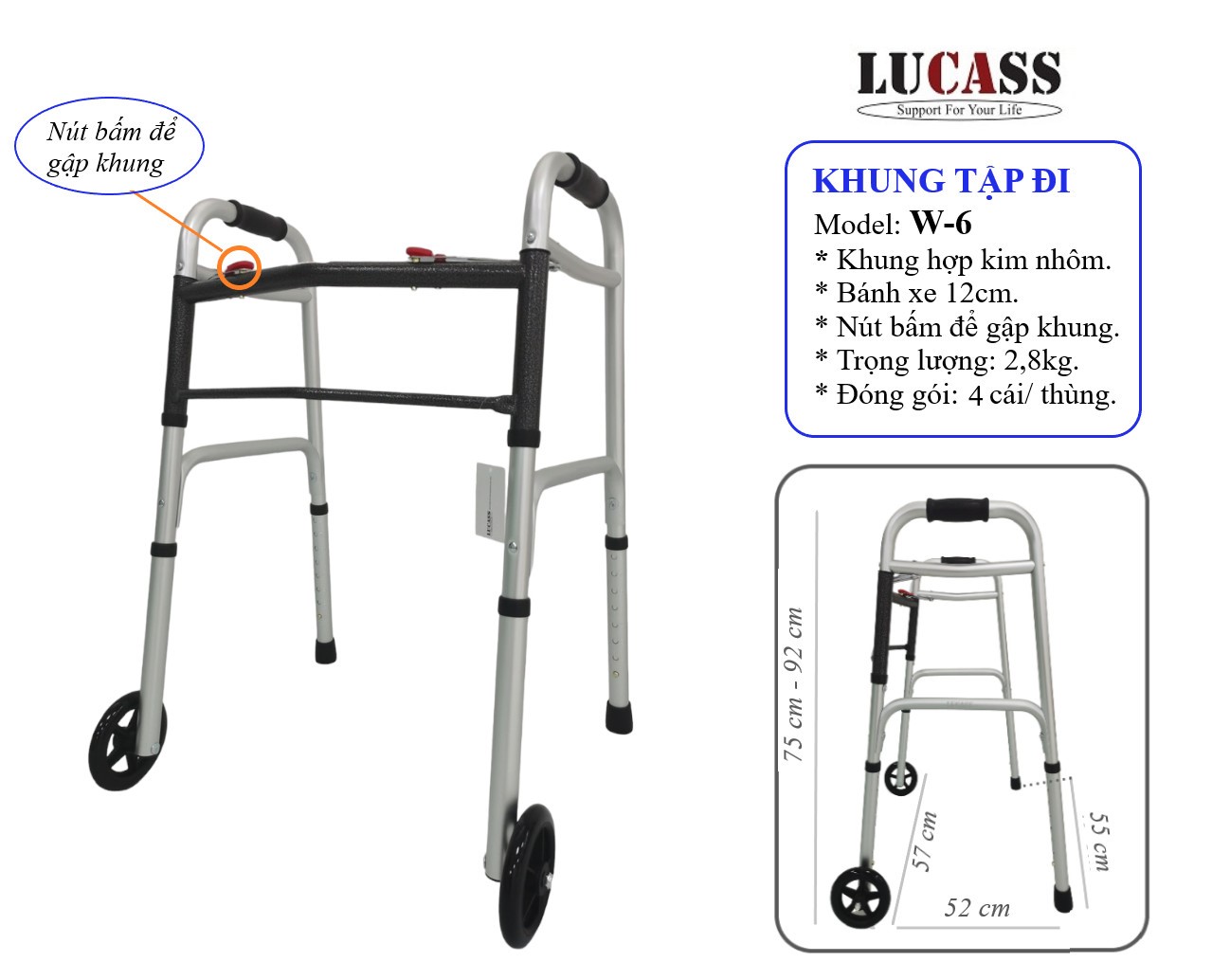 - Khung tập đi Lucass W6 được làm bằng hợp kim nhôm tạo độ an toàn, chắc chắn, kiên cố cho người sử dụng.