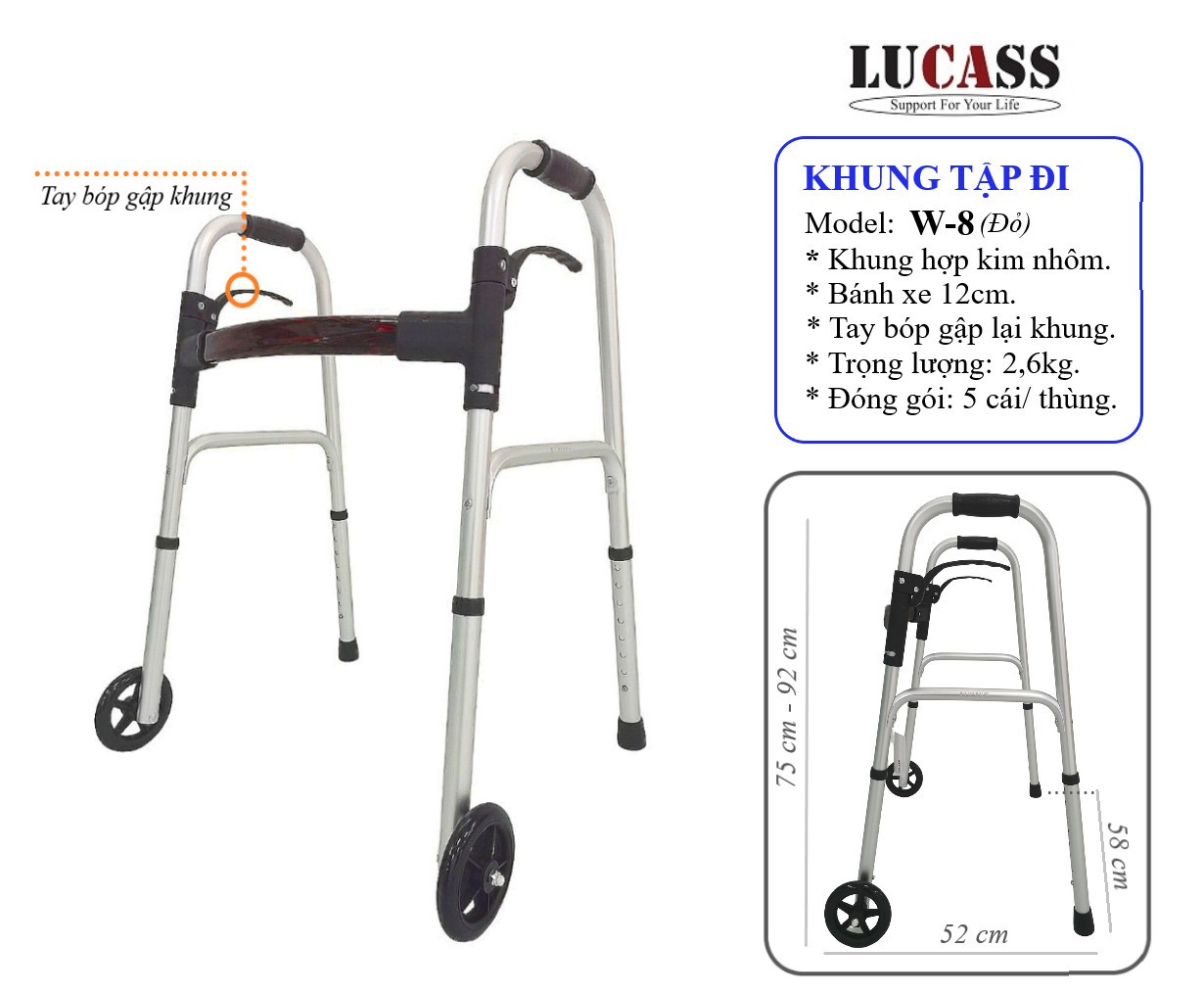 - Khung tập đi Lucass W8 được làm bằng hợp kim nhôm tạo độ an toàn, chắc chắn, kiên cố cho người sử dụng.