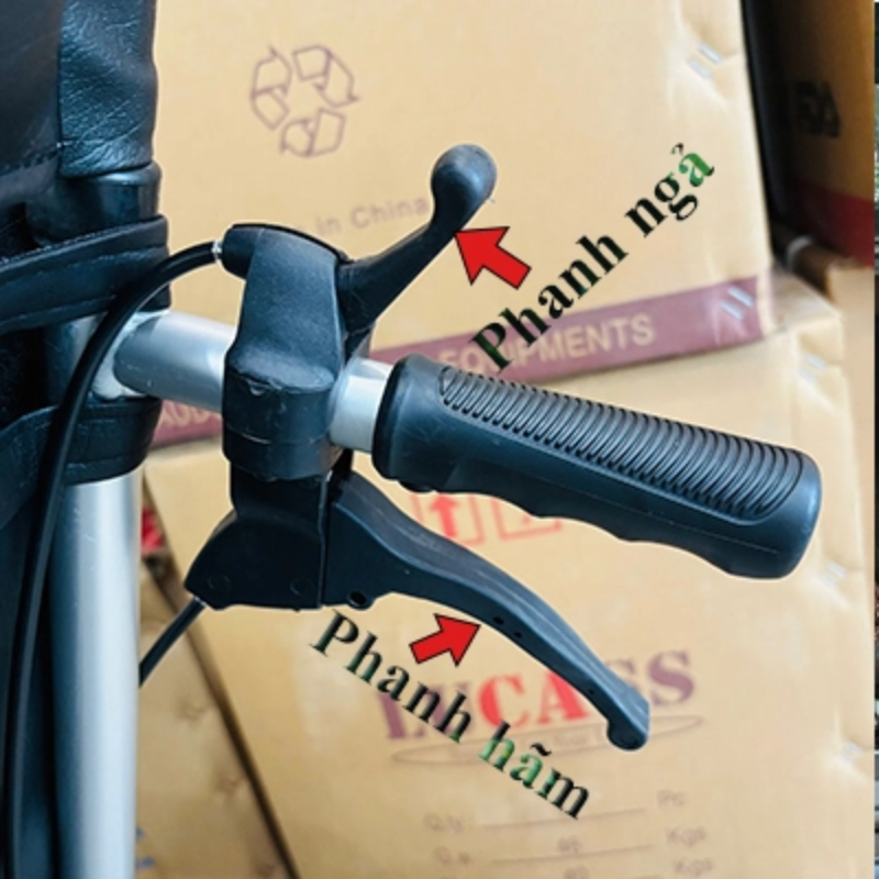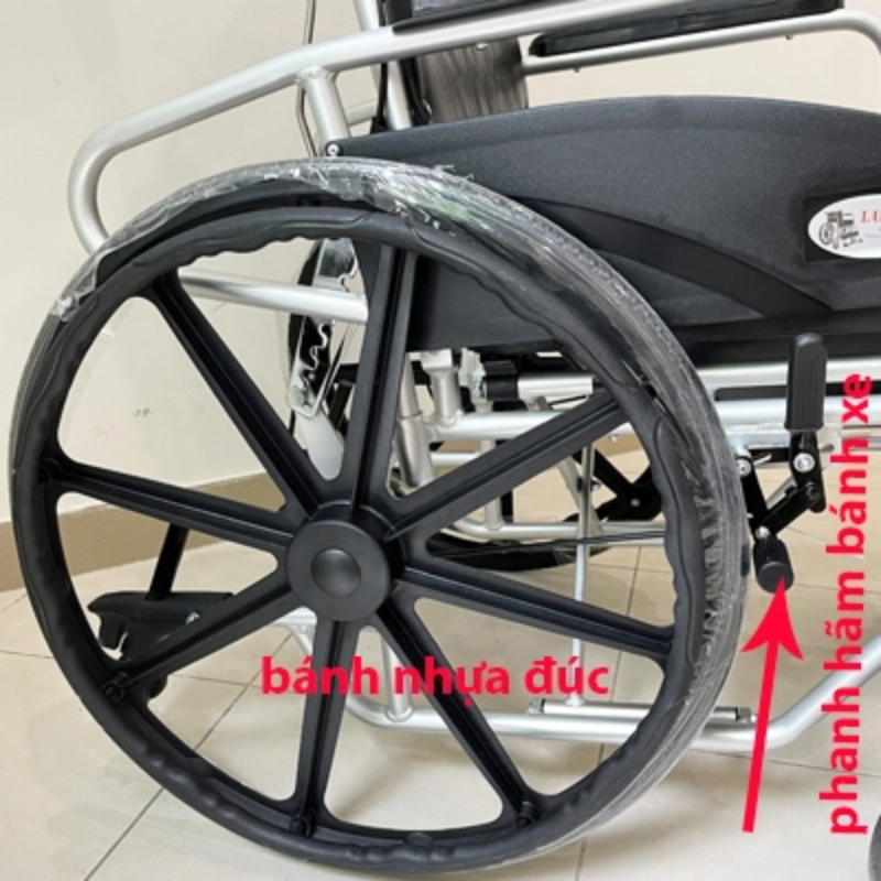 - Bánh sau đường kính 59cm được làm bánh nhựa đúc rất chắc chắn. Lốp làm bằng cao su đặc, không bơm hơi - Hai bên bánh xe có phanh hãm để xe đứng yên khi không cần di chuyển.