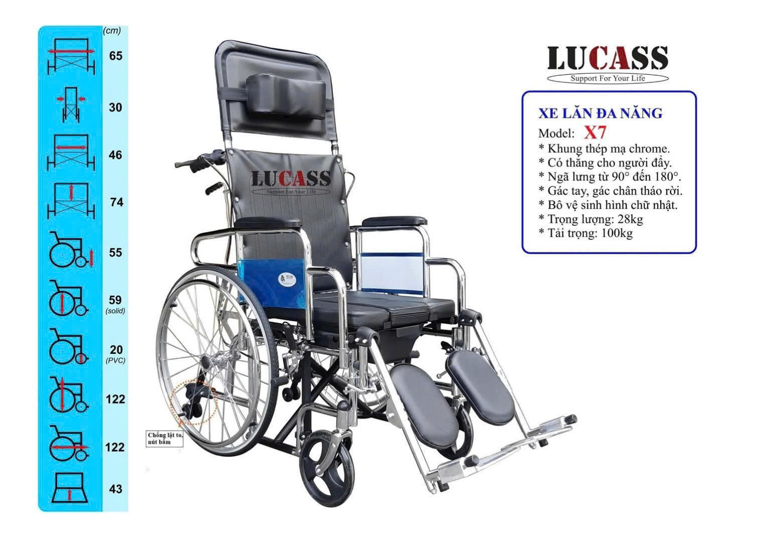 Xe lăn tay đa năng Lucass X-7 là dòng xe lăn cao cấp của Lucass được sản xuất trên dây chuyên công nghệ hiện đại. Lucass X-7 rất được ưa chuộng vì có thiết kế gọn nhẹ nhưng vô cùng chắc chắn. Bên cạnh đó, xe lăn X-7 còn có nhiều tính năng giúp bệnh nhân thoải mái hơn như di chuyển, có bô vệ sinh, có chế độ ngã lưng, có thắng tay,.v.v...