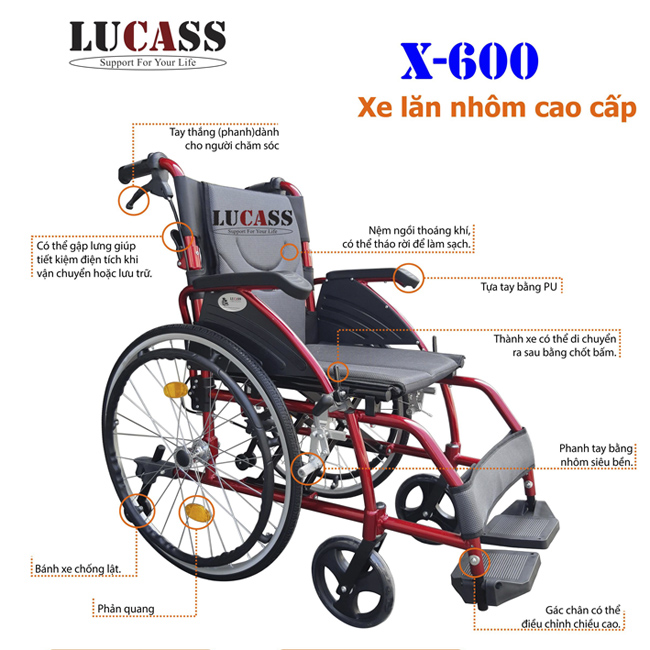 - Xe lăn tay Lucass X-600 là dòng xe lăn tay tiêu chuẩn phù hợp cho người già, người bệnh, người khuyết tật, được nhiều bệnh viện, phòng khám hay gia đình tin dùng.
